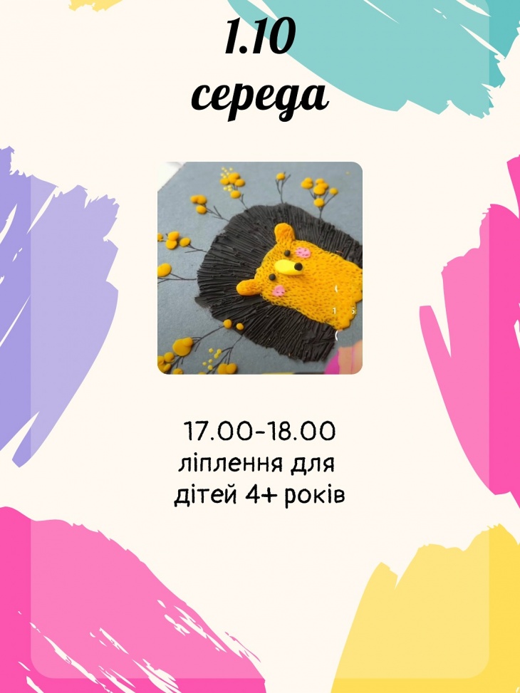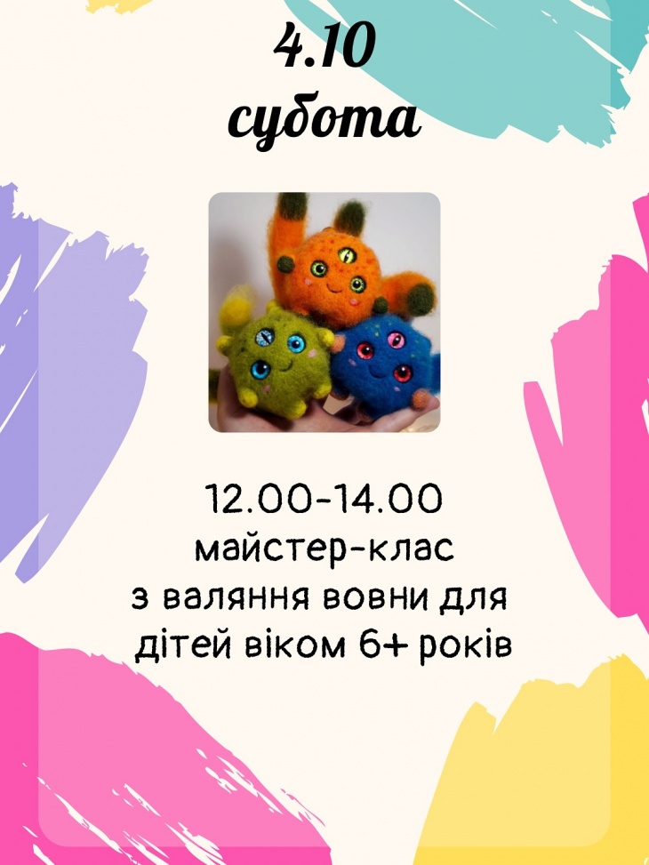 - 12:00 - 14:00 — майстер-клас "Валяння вовною" 6+